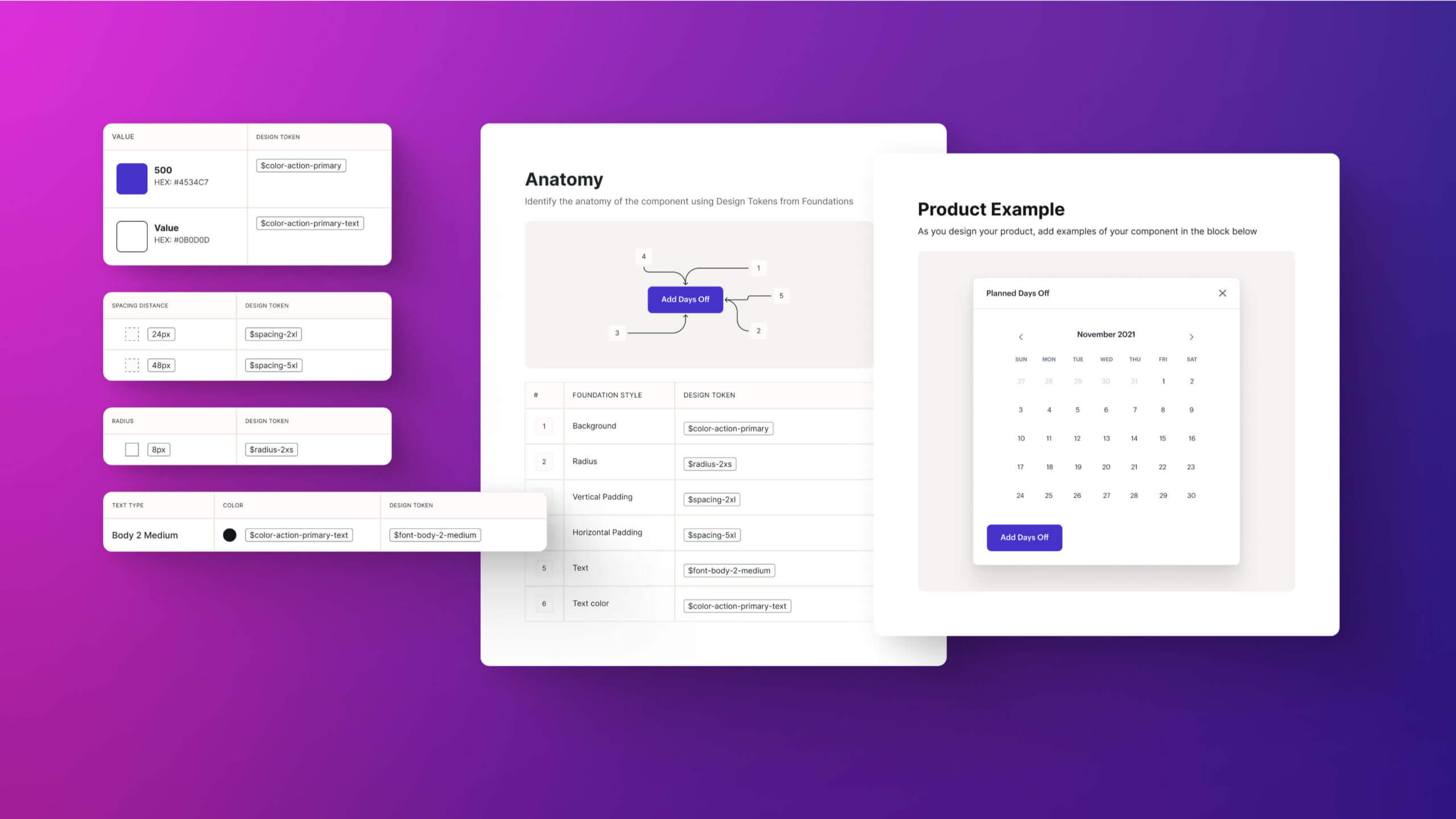 Foundational tokens like spacing, typography, and color come together to form consistent, reusable components that scale across the product